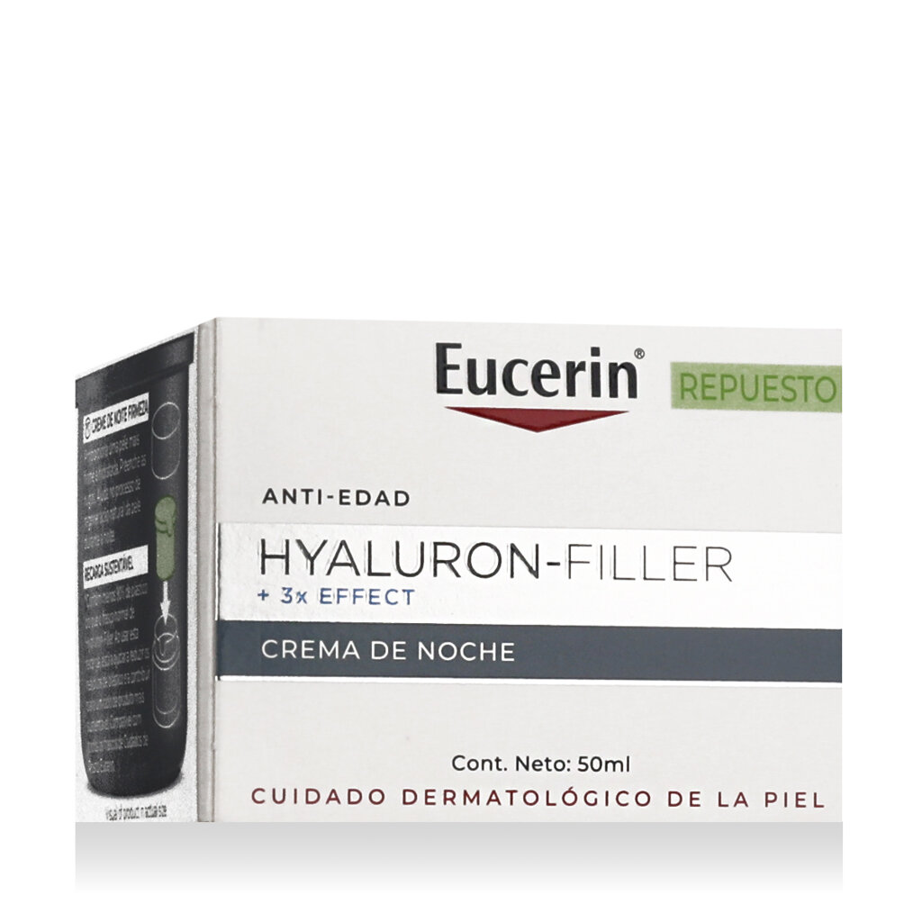 Eucerin Hyaluron-Filler + 3x Effect Night Cream Refill 50 ml ist eine Anti-Age-Nachtcreme in Form einer Nachfüllpackung, die Falten in der Nacht, wenn die Haut am aufnahmefähigsten für die Regeneration ist, effektiv entgegenwirkt. Sie enthält eine Kombination aus drei Wirkstoffen - Hyaluronsäure, Saponin und Enoxolon- die zusammen Feuchtigkeit spenden, die Produktion der hauteigenen Hyaluronsäure fördern und deren Abbau verlangsamen. Geeignet für alle Hauttypen, auch für empfindliche Haut.