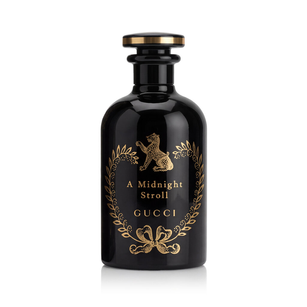 A Midnight Stroll von Gucci ist ein holziges Unisex-Parfüm, das 2020 auf den Markt kam und von Alberto Morillas kreiert wurde. Dieser Duft konzentriert sich auf tiefe, aromatische und rauchige Noten, die eine dunkle und geheimnisvolle Atmosphäre schaffen. Das Parfüm eröffnet mit einem reichen und intensiven Weihrauchakkord, der dem Duft einen ausgeprägten rauchigen und bernsteinfarbenen Charakter mit einer leicht balsamischen Note verleiht.