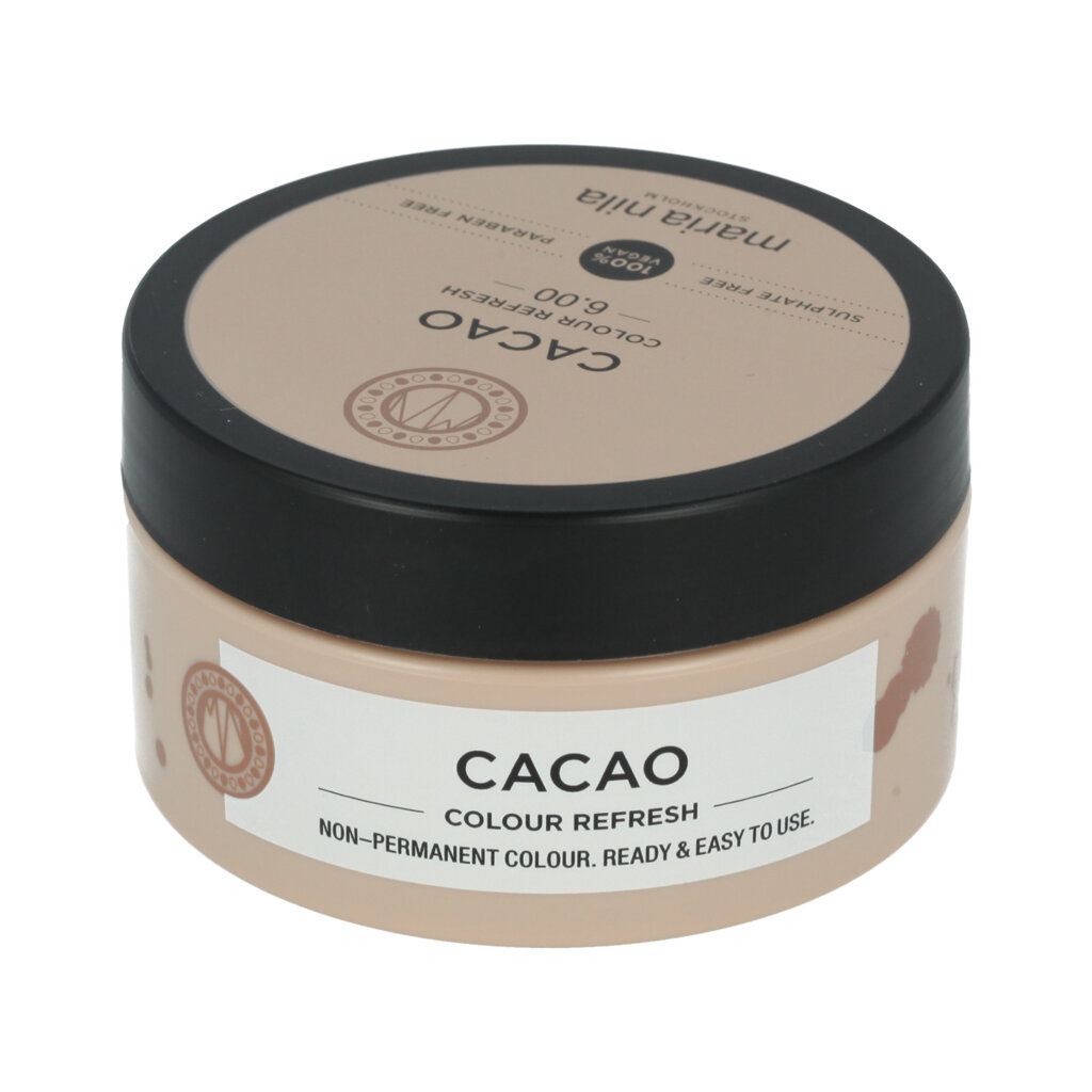 Maria Nila Colour Refresh Haarmaske mit Farbpigmenten Cacao 100 ml ist eine pflegende Haarmaske, die dem Haar einen satten Braunton mit warmen Nuancen verleiht. Dank der mit Arganöl angereicherten Formel spendet die Maske Feuchtigkeit, regeneriert und macht das Haar weich und glänzend. Die Farbe wäscht sich allmählich aus und ermöglicht so eine vorübergehende Veränderung oder Auffrischung der bestehenden Haarfarbe.