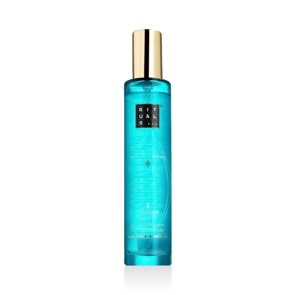 Rituals The Ritual of Karma Hair & Body Mist 50 ml ist ein erfrischender Körper- und Haarnebel, der Haut und Haar sofort mit einem zarten Sommerduft umhüllt. Die Kombination aus heiligem Lotus und weißem Tee sorgt für ein Gefühl von Ruhe, Frische und positiver Energie, während die leichte, alkoholfreie Formel sanft zu Haut und Haar ist.
